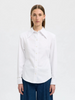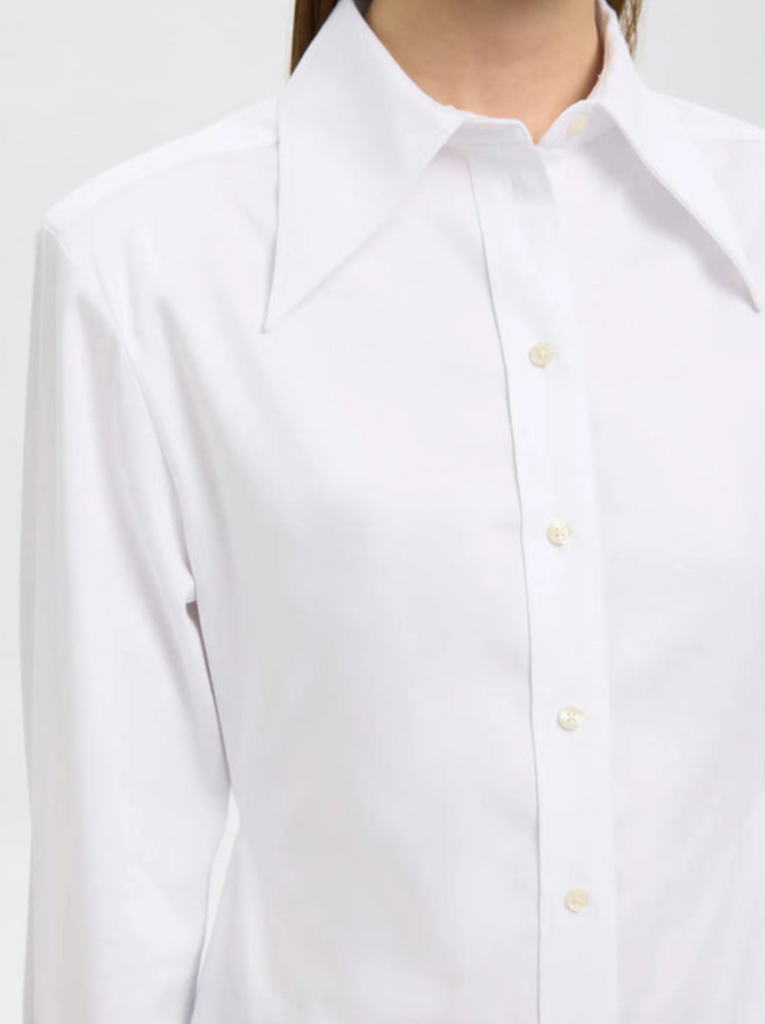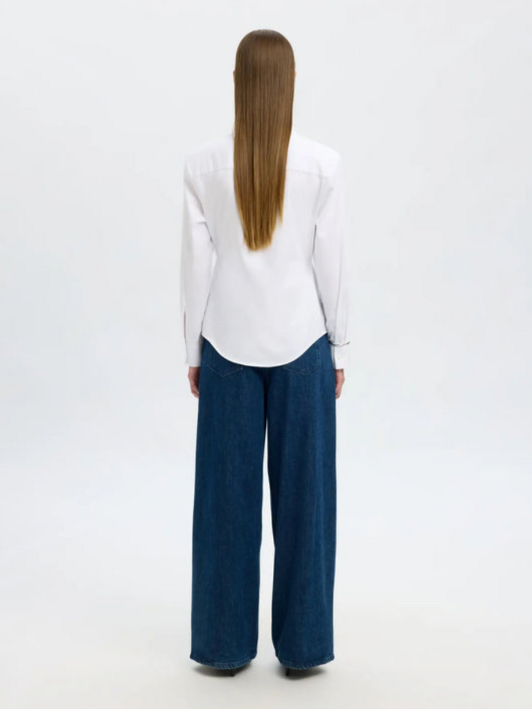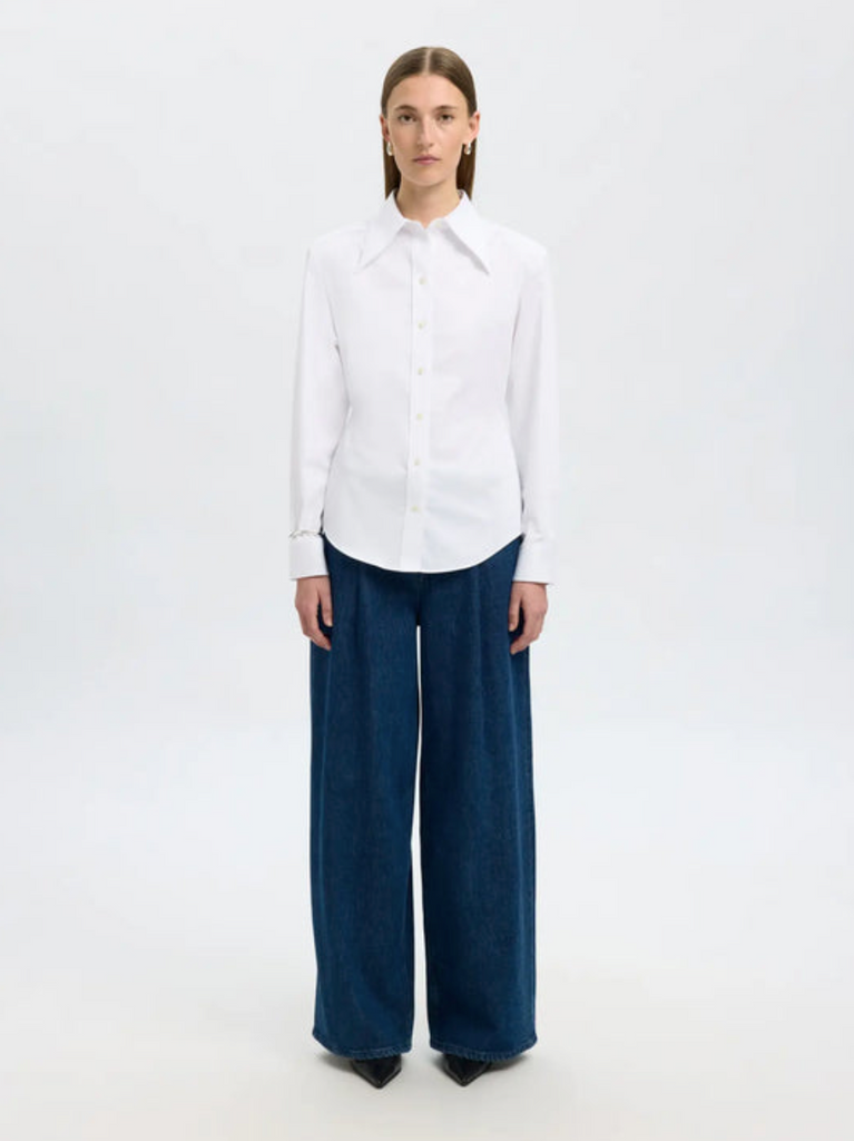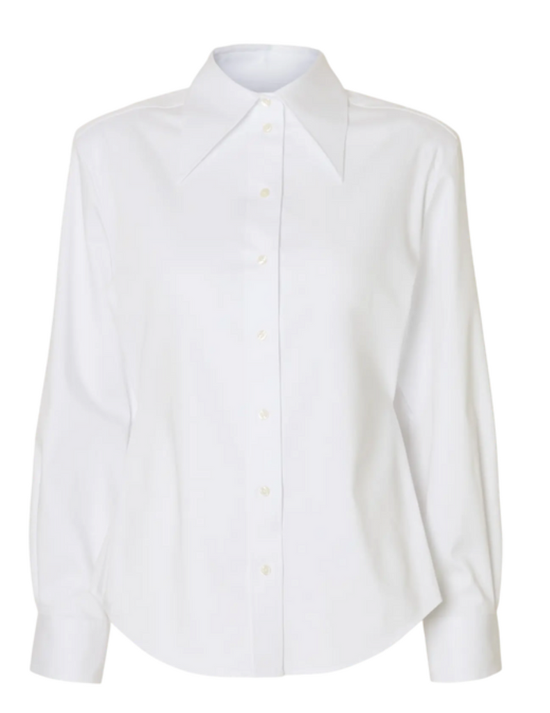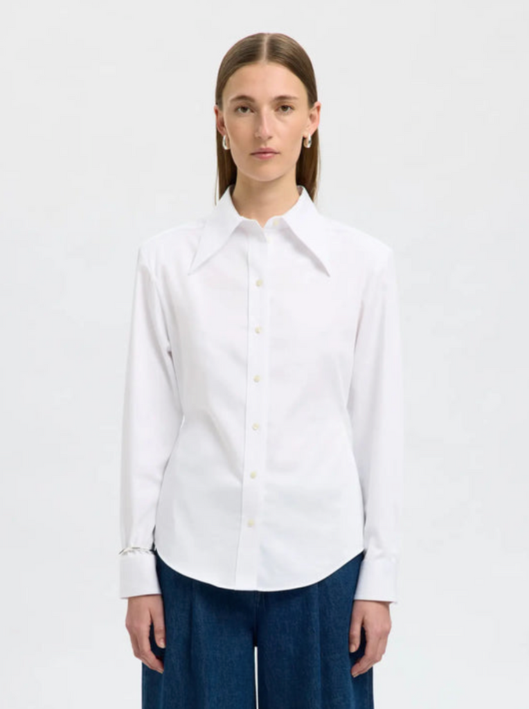 Nicolina Slim LS Shirt fra Selected Femme er en klassisk hvit skjorte i crisp bomullskvalitet med en moderne tvist. Skjorten har en smal passform som fremhever en feminin silhuett, og en markert spiss krage som gir et løftet uttrykk. Den lange lengden med avrundet kant gjør den enkel å style både til dressbukser og denim, og gjør skjorten til et tidløst baseplagg i garderoben året rundt.