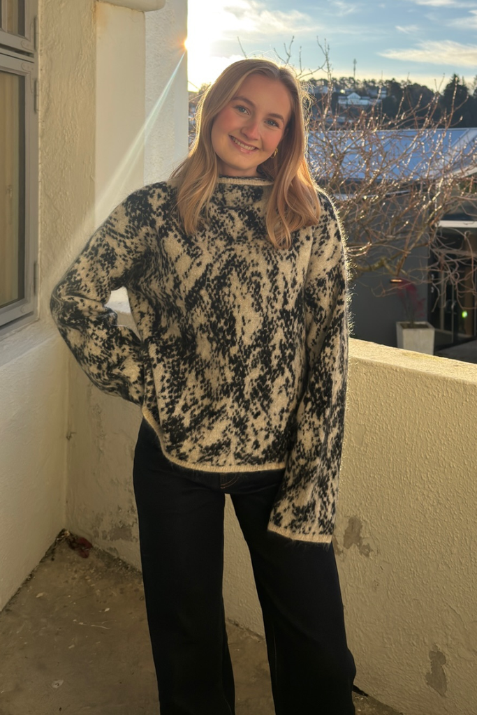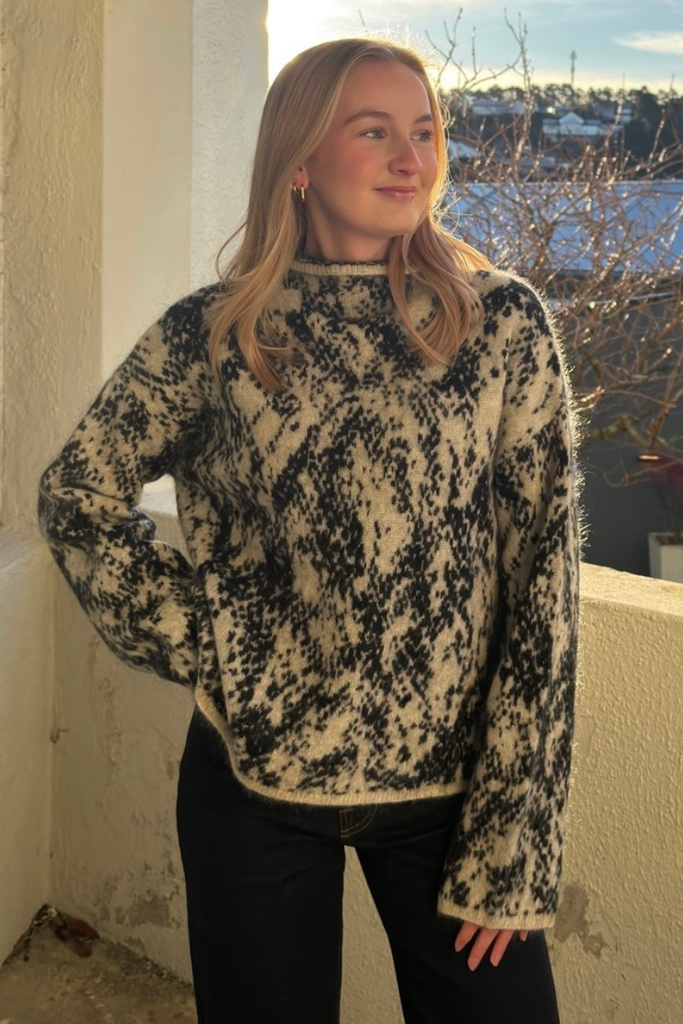Second Female mønstret høyhalset genser. Genseren er laget i en myk mohair- og ullblanding med helhetsmønster. Den har høy hals, droppede skuldre og lange ermer. Kontrastkant i hals, mansjetter og nederkant. Avslappet og vid passform.
