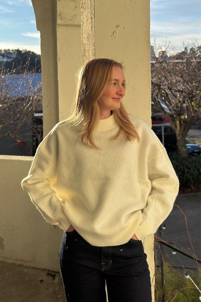 Second Female genser med rund hals og lange ermer. Genseren er laget i en kompakt merinoblanding. Den har rund hals, ingen skuldersøm og avsmalnede ermer. Diagonale sømdetaljer. Ribbekant i hals, mansjetter og nederkant. Oversized passform.