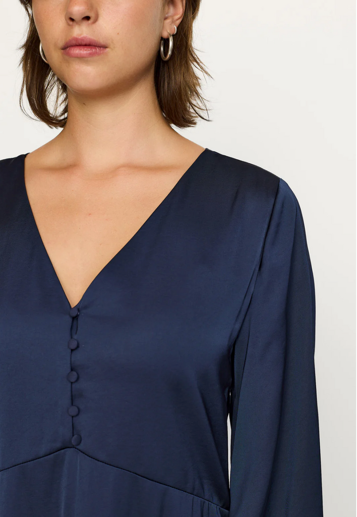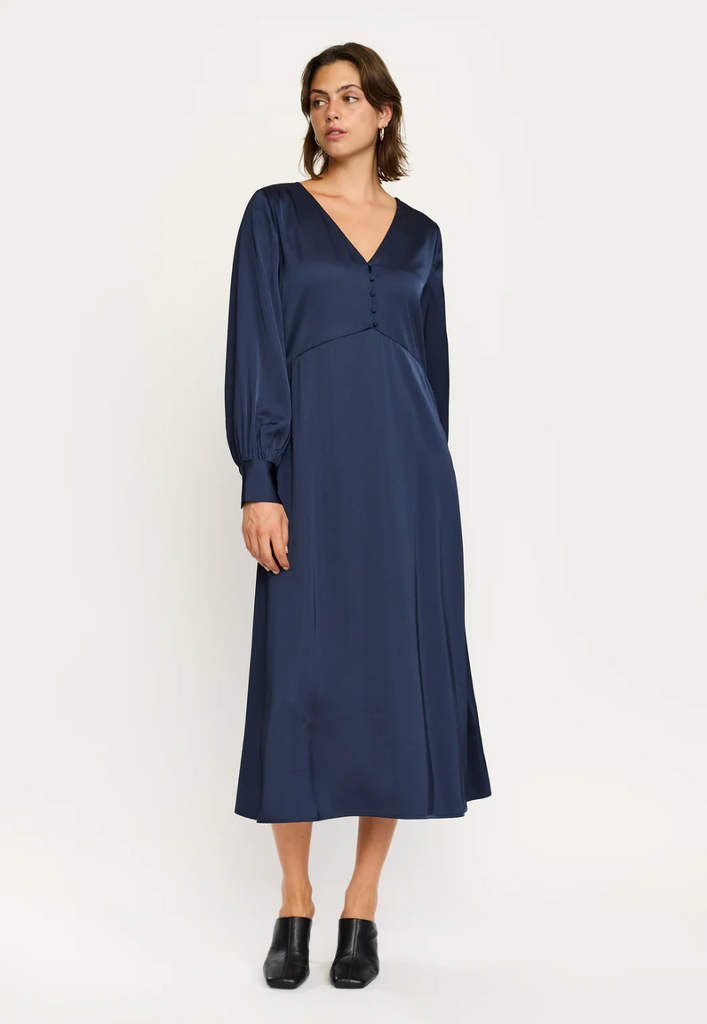 SRAbia Midi Dress er en lekker og tidløs kjole i en nydelig blåfarge som gir antrekket et friskt og sofistikert uttrykk. Kjolen har en feminin midilengde med en ren og minimalistisk silhuett som gjør den like perfekt til hverdags som til mer pyntede anledninger.